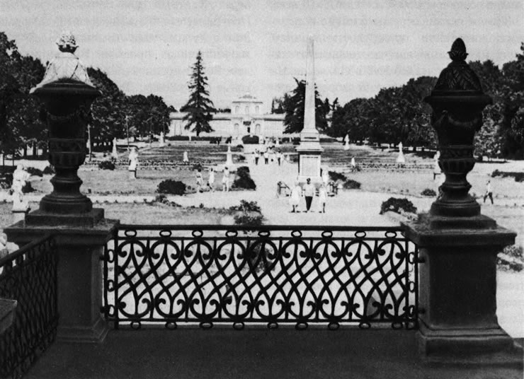 За пределами "партера" дорожки парка, сходясь, образуют в плане многолучевые звезды. Каждая дорожка в своей перспективе замыкается статуей или ризалитом дворца, либо фасадом садового павильона. Со всех сторон нас обступают здесь законченные архитектурно-пространственные картины.