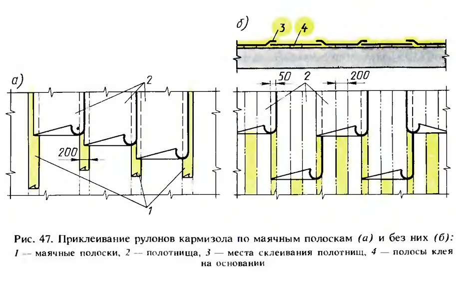 Грунтуют основание в местах приклейки кармизола в процессе наклеивания рулонов. Клеящий слой наносят на основание полосами. Рулон кармизола разрезают по длине на полоски шириной 20 см. Каждую полоску 1 (рис. 47, а) приклеивают по огрунтованному основанию на расстоянии, равном ширине рулона (по осевым линиям). Рулоны раскатывают таким образом, чтобы края двух соседних полотнищ соединялись встык по осевой линии полос. Края рулонов (по 10 см от каждого края), уложенные на полосу, приклеивают к ней. Стыки рулонов промазывают два раза клеем.
